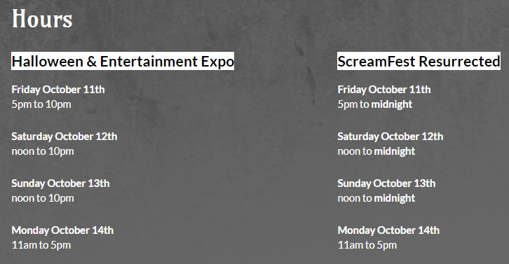 欢迎参加第一届致力于万圣节爱好者的加拿大粉丝大会!从2019年10月11日至14日,享受万圣节名人,角色扮演,服装和零售展品,操作方法班和课程,鬼屋,放映厅等等!星期一是HEX的家庭日。