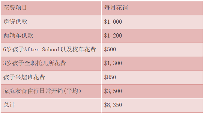 家庭每月收入:杨先生扣除CPP、EI、Tax、RRSP以及公司Pension等,每月可以拿到手上的收入大概是$6000/月;杨太太扣除CPP、EI、Tax等,每月可以拿到手上的收入大概是 $3000/月,合计$ 9000/月