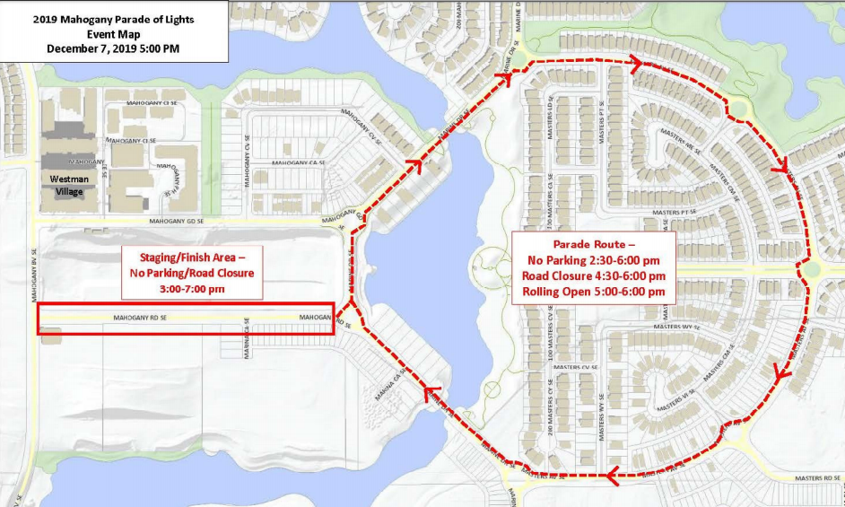 游行将在未来的中央公园附近开始,并沿Masters Ave沿Mahogany loop内环行。圣诞老人和克劳斯夫人将结束游行,游行还将包括当地团体,企业,街区和特别惊喜的客人!