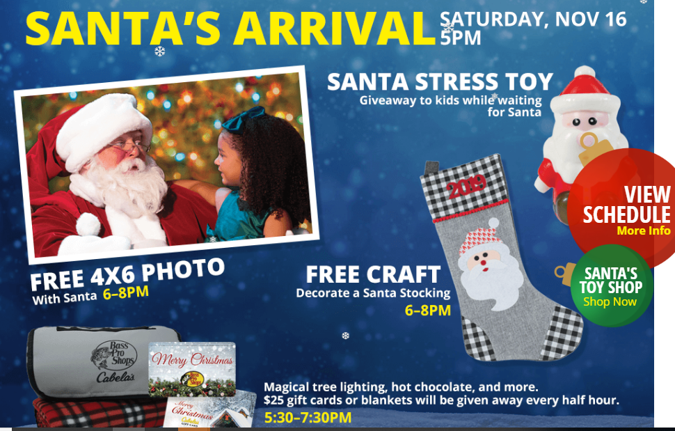 11月16日--12月24日可到Bass pro shop & Cabela’s store 可同圣诞老人免费拍照。
