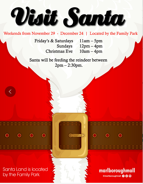 还要记住带孩子们并于2019年12月7日,14日,21日和28日参观Marlborough Mall 购物中心,从下午1-3点在家庭公园参加假日工艺品。