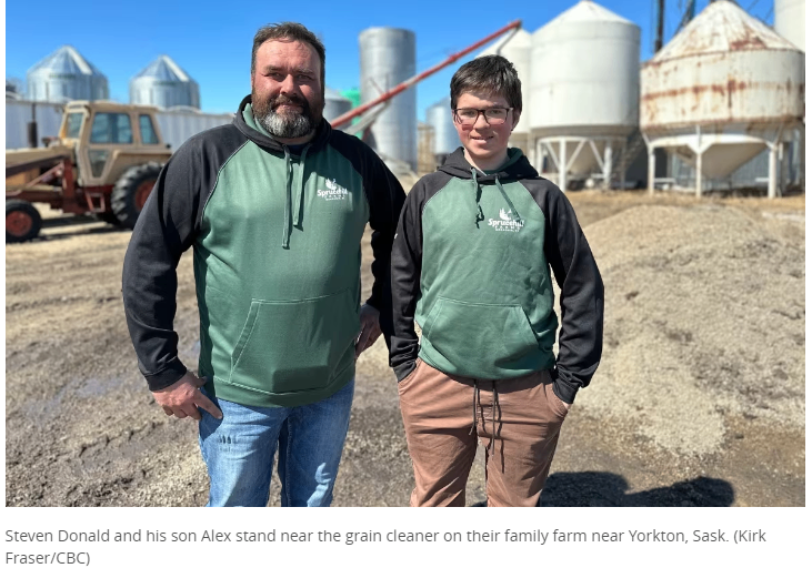 史蒂文·唐纳德 (Steven Donald) 和他的儿子亚历克斯 (Alex) 站在他们位于萨斯克省约克顿附近的家庭农场的谷物清洁工旁边。(柯克弗雷泽/加拿大广播公司)在阳光明媚的日子里,一名 40 多岁的男子站在一名少年旁边看着镜头。他们穿着胸前带有家庭农场标志的配套连帽衫。