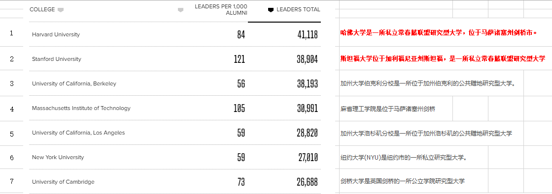 然后,他们搜索了拥有高管头衔的校友,例如首席执行官 CEO、首席财务官CFO、首席运营官COO、首席技术官CTO、首席信息官CIO 和首席安全官CSO,并根据商界领袖人数和每 1,000 名校友中的领导人人数对大学进行排名。这些数据收集于 2022 12 月。