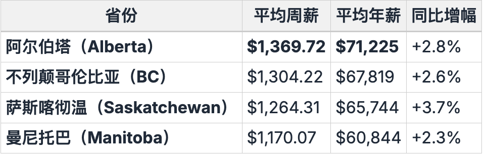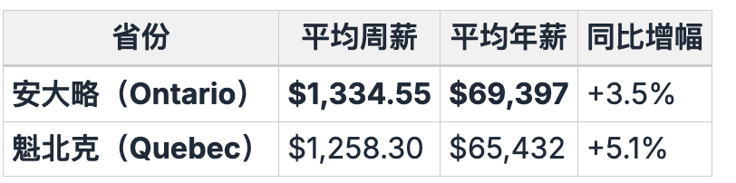 根据加拿大统计局(Statistics Canada)最新数据,2025年6月全国平均周薪为 $1,302,同比增长 3.7%