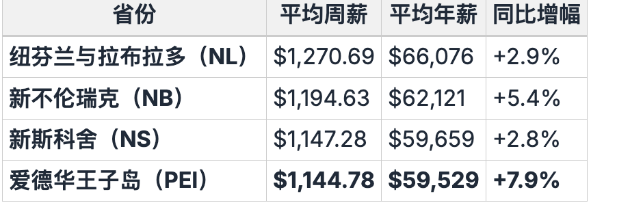* PEI工资最低,但涨幅最大(7.9%)。