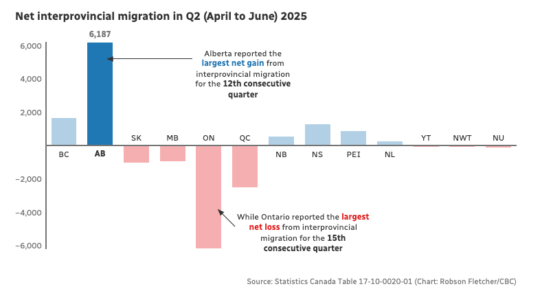 艾伯塔省在 2025 年第二季度 通过省际迁移净增加 6,187 ,继续保持全国第一。
