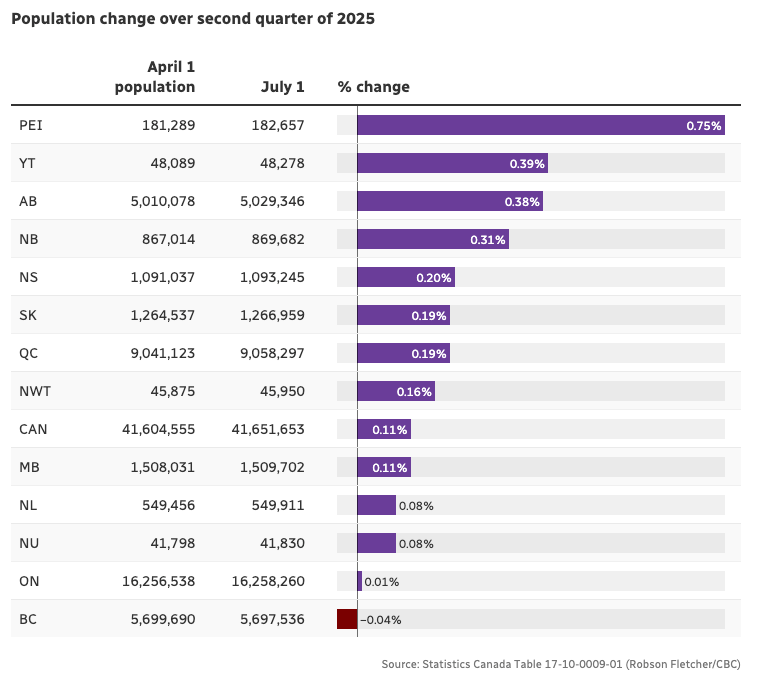 不列颠哥伦比亚省(BC 省) 是本季度唯一出现人口减少的省份,减少了 0.04%