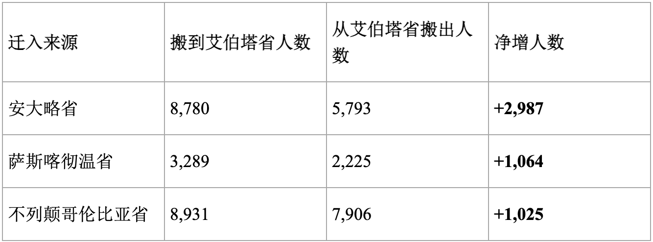 艾伯塔省新增的跨省居民主要来自 安大略省、萨斯喀彻温省和不列颠哥伦比亚省