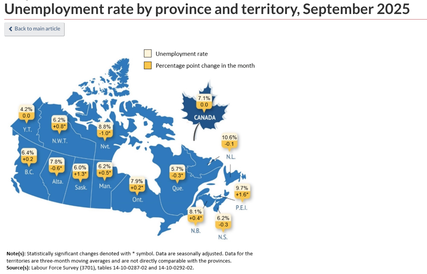 加拿大统计局(Statistics Canada)周五表示:9 月失业率维持在 7.1% 不变,全国新增约 6 万个就业岗位。