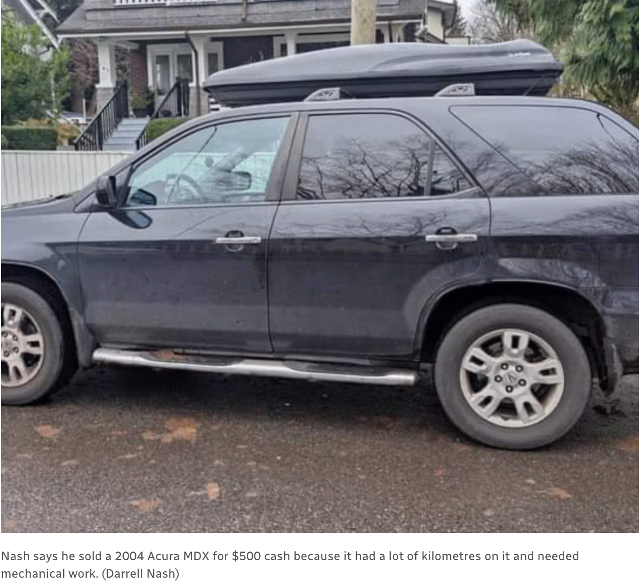 纳什称这辆 2004 款讴歌 MDX 因公里数很高且需要维修,只以 500 元现金售出。(Darrell Nash)这车不值钱——行驶里程超 30 万公里,还有机械问题——他们以 500 元现金卖掉。买家填了相应的过户表,自己带了牌照,然后把车开走了。