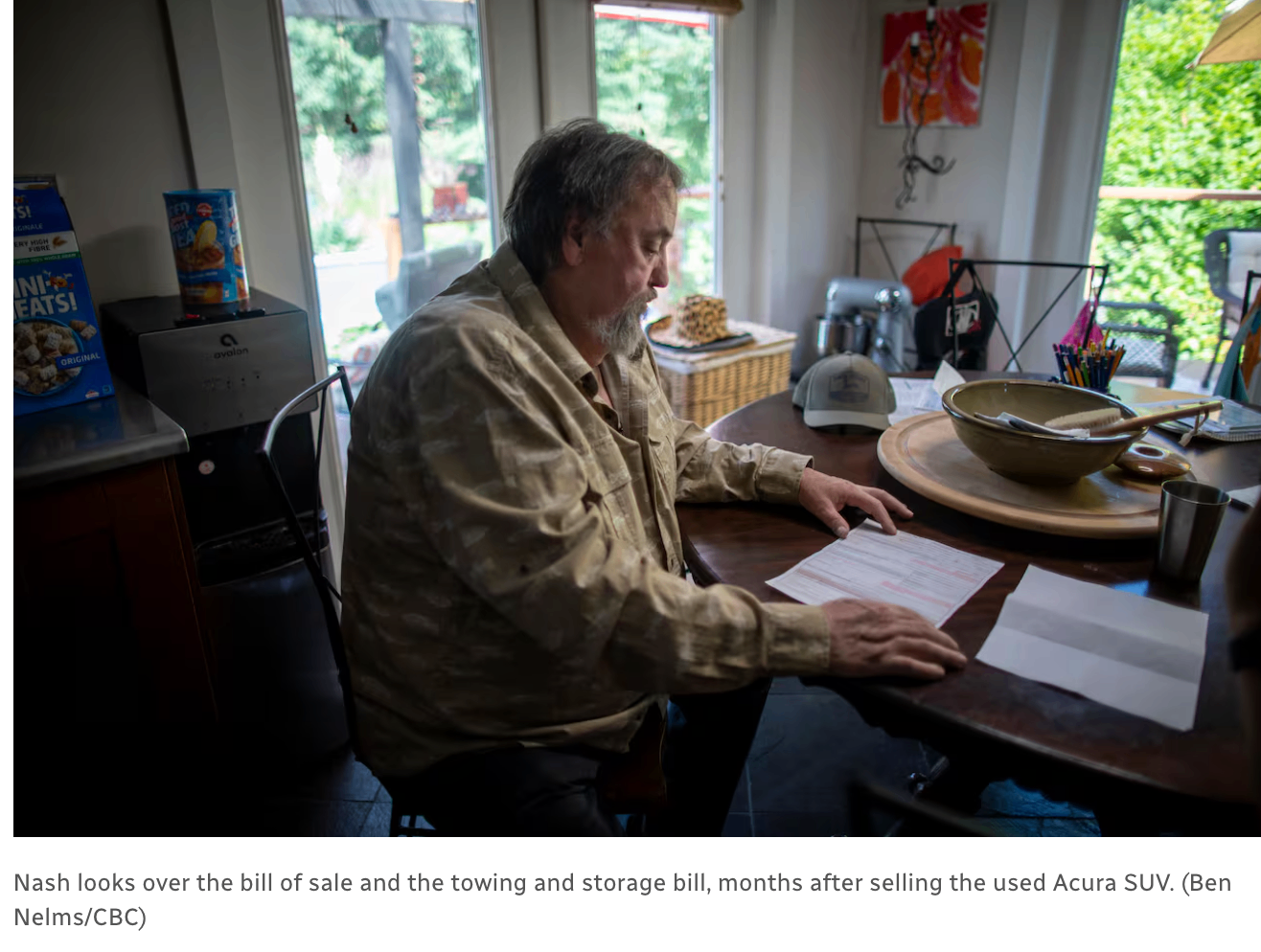 卖掉二手讴歌 SUV 数月后,纳什仍在查看买卖合同和拖车保管账单。(Ben Nelms/CBC)
