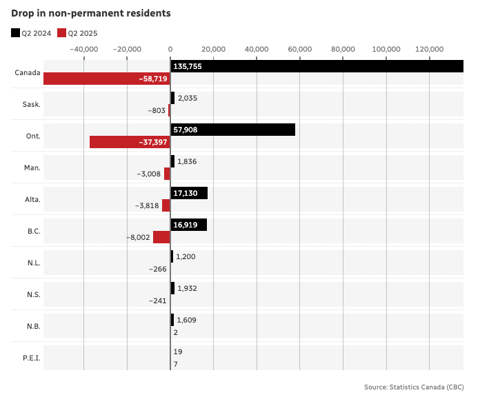 加拿大统计局数据显示,萨省非永久居民净流入(包括留学生和临时外劳)也急剧下降: