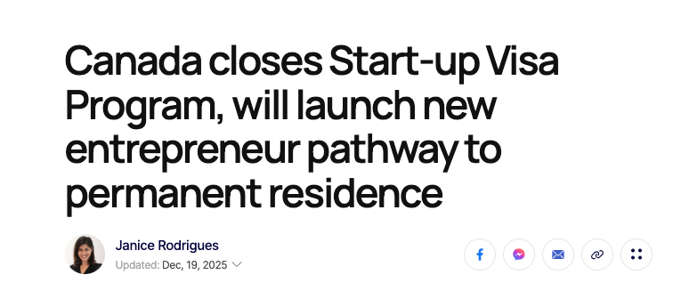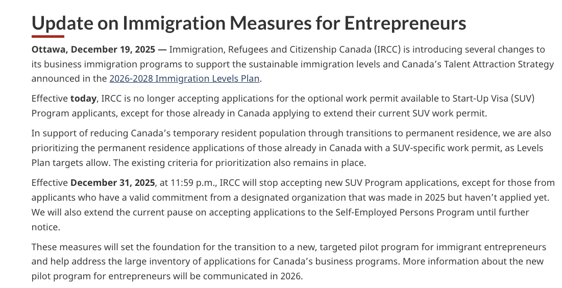 12 月 19 日,IRCC 宣布,将不再接受创业签证(Start-up Visa,简称SUV)申请人的工作签证申请,