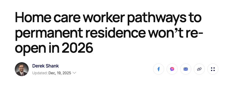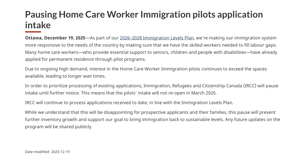 根据今日刊登在《加拿大宪报》(Canada Gazette)上的部长级指令,移民部表示: 自 2026 年 3 月 31 日起至 2030 年 3 月 30 日止, 家庭护理人员移民试点项目将不再接受任何新的申请。