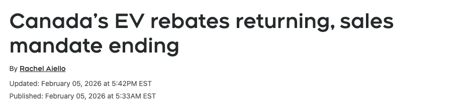与上述目标一致,自由党政府听取了汽车产业和政治批评人士的呼声,决定废除特鲁多时期制定的电动车销售强制令——该政策原本要求 2035 年电动车占加拿大新车销量的 100%。
