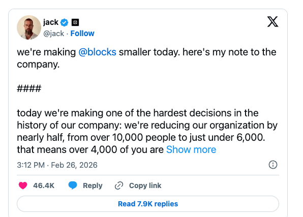 Block 首席财务官 Amrita Ahuja 在公司财务指引中更直接地表示:“我们看到机会,可以通过规模更小、但高度专业的人才团队,借助 AI 自动化更多工作,从而更快前进。”