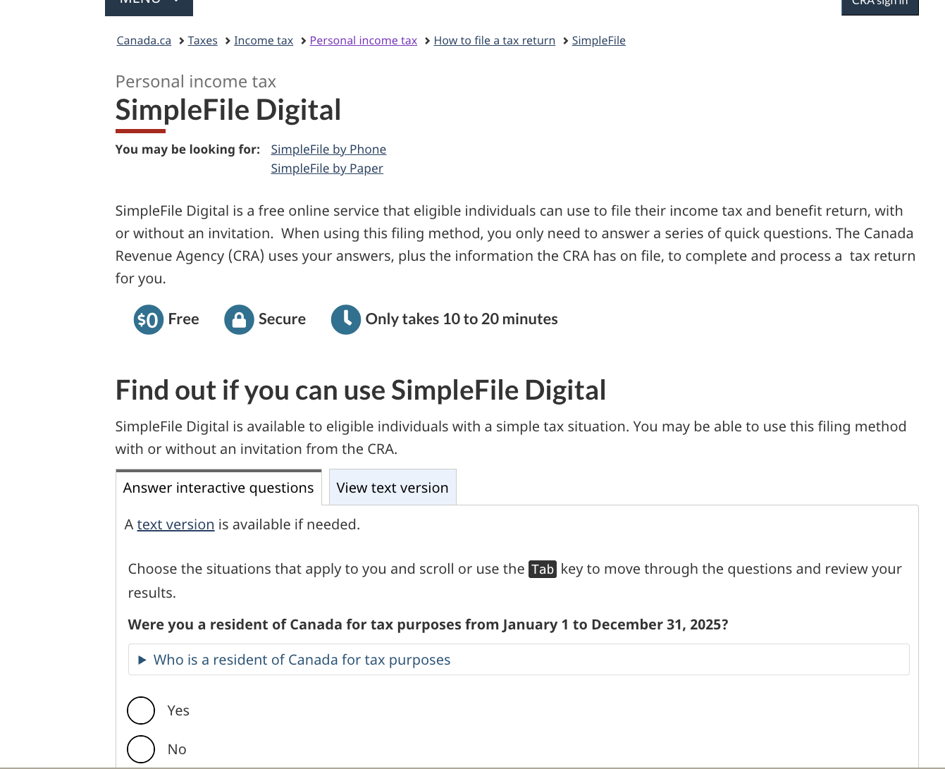 即使你没有收到 CRA 的邀请,你今年仍可能可以使用 SimpleFile Digital 来报税。CRA 新增了一个资格问卷(eligibility questionnaire.),用来判断你是否可以使用这项免费服务。