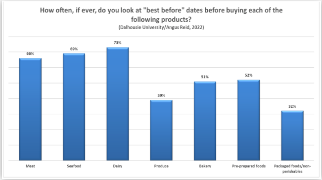人们检查日期的频率也很大程度上取决于食物类别。近四分之三的加拿大人表示,他们总是检查乳制品的“最佳食用日期”,而只有三分之一的人表示他们检查预包装食品的“最佳食用日期”