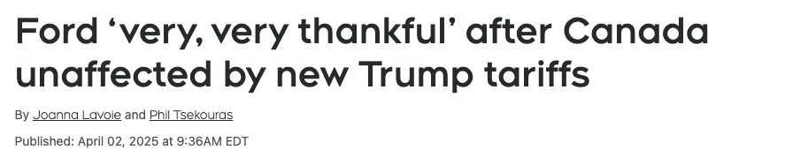 安大略省省长道格·福特(Doug Ford) 在接受 ABC 新闻采访时表示,他对加拿大未被列入美国总统特朗普新宣布的进口关税名单感到“非常、非常感激”。