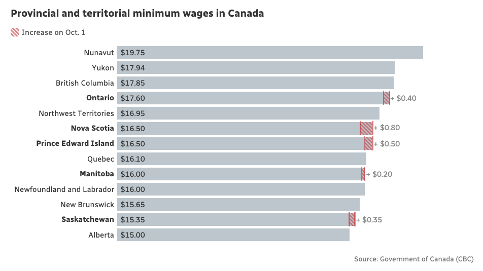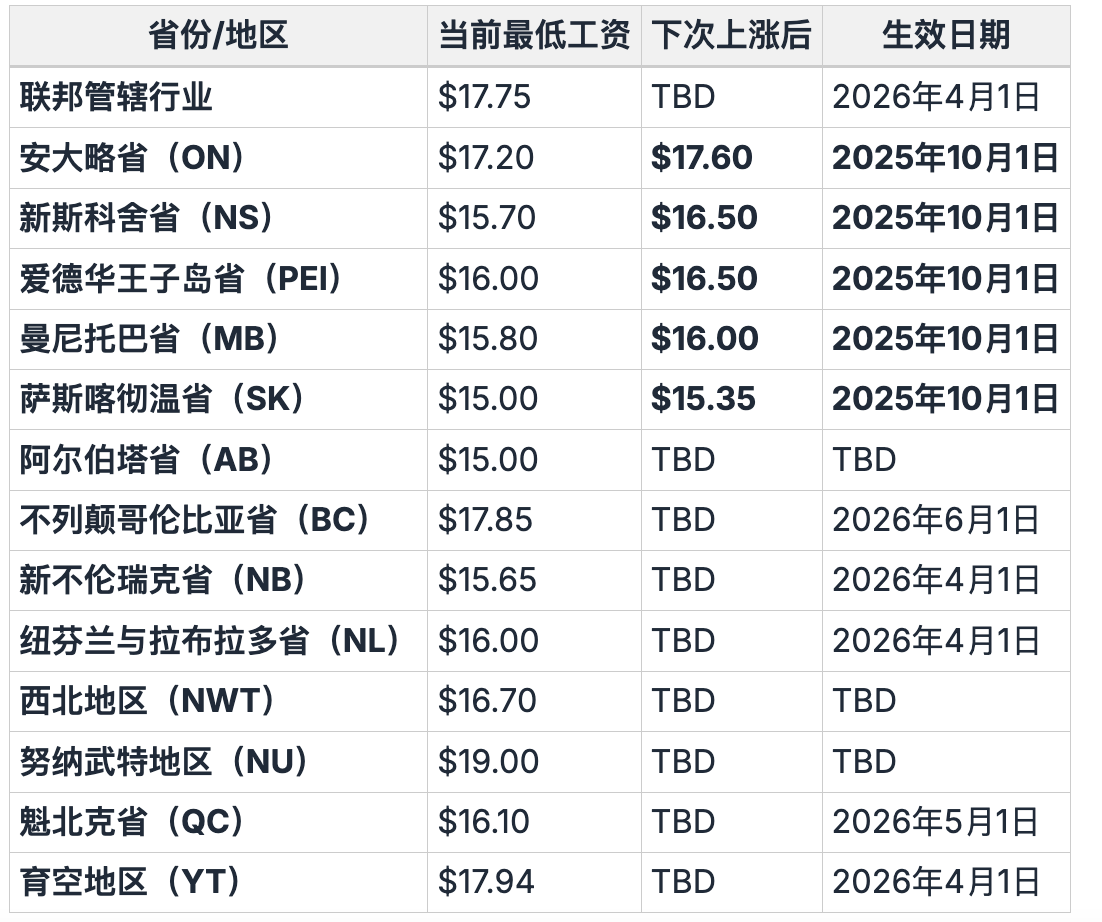 2025年10月1日起,加拿大5个省份上调最低工资标准