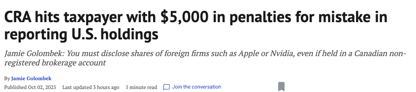 CRA 因漏报美国资产,对纳税人罚款5,000 加元.