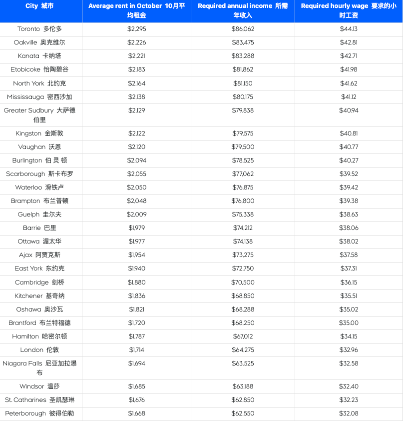 根据Zoocasa 的数据,以下是10 月份安大略省各地一居室公寓的平均租金,以及单人收入要“舒适负担”这些租金所需的理想收入水平