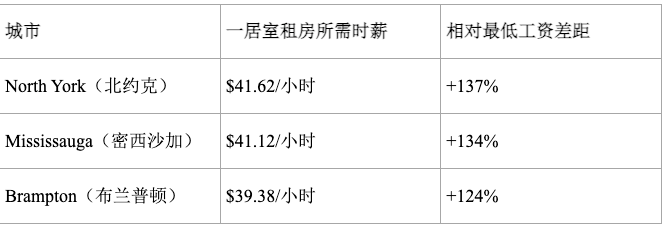 这些差距显示,即便在大多伦多周边,全职最低工资劳动者也无法单独负担一居室住房