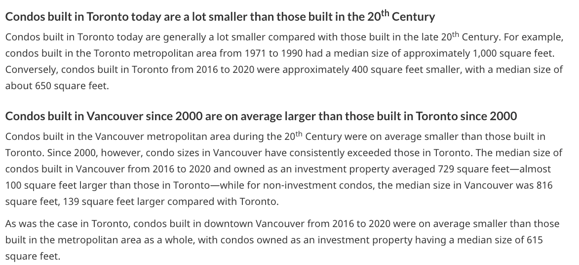 相较之下,2016 年至 2020 年在多伦多建造的公寓平均小约 400 平方英尺,中位面积仅约 650 平方英尺