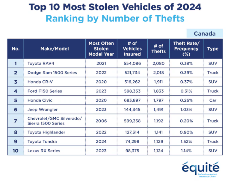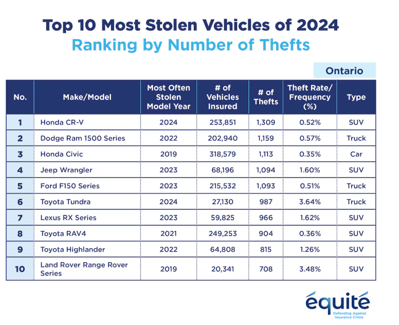 2024 年安省最常被盗车辆榜单(Équité 数据)