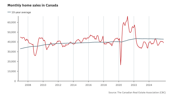 2025 年 12 月,加拿大两大市场的房屋销量跌至 20 年低点