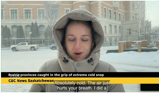 CBC 电台主持人坎迪斯·利普斯基在体感温度达到 **-48°C(含风寒效应)**的地区进行现场报道。