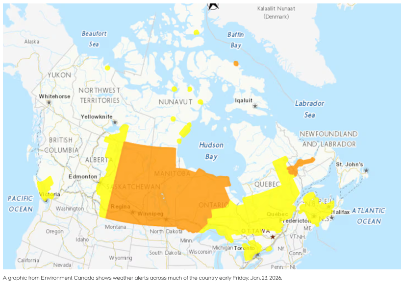 加拿大环境部对萨斯喀彻温省和曼尼托巴省全境以及安大略省北部大部分地区发布了橙色天气警报,警告称恶劣天气可能会造成重大破坏、混乱或健康影响。