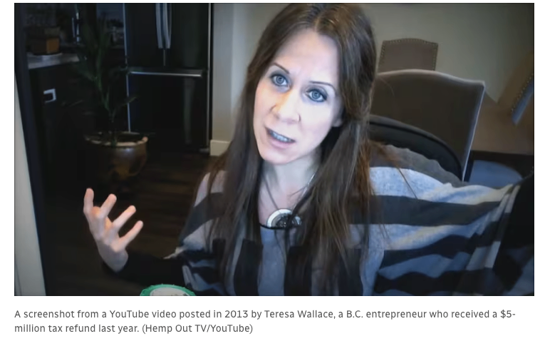 根据 CBC(the fifth estate)和加拿大广播电台 Radio-Canada 获取的法庭文件,去年 5 月,这笔七位数的退款被支付给了 Teresa Wallace。文件称,她在位于卑诗省 Silverton 的大麻和谷物加工企业通常年收入约为 54,000 加元。Silverton 位于 Nelson 以北 95 公里、西库特尼地区。