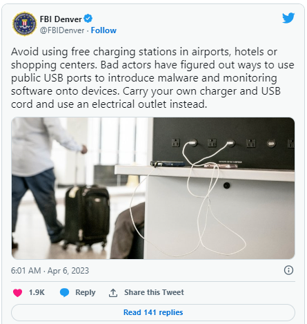 根据联邦调查局丹佛分局上周发布的一条推文表示,商场和机场的公共USB站正被不法分子用来传播恶意软件和监控软件。该机构没有提供任何具体的例子。