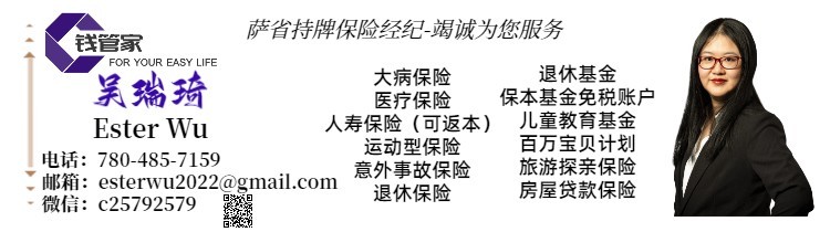 加拿大有四大税务优惠账户,您都知道吗?您身边的钱管家们每个都可以帮您开户:TFSA/RRSP/RESP/IRP,帮助大家加快财富积累。除了税务,小孩子的牛奶金,教育基金,重大疾病的保障和收入替代,人生第一次买房,公司或个人财富的传承,有这些问题,想走捷径,就联系Ester Wu 吧!有一个靠谱专业的理财顾问为您把关,一定是事半功倍的。