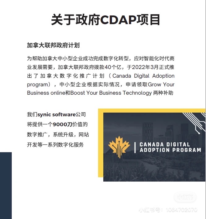 各位老板们,2022年三月,特鲁多政府启动了总额40亿加元的CDAP项目,旨在支持中小企业发展。Synic Software被政府指定为数字顾问,资金有限,先到先得。赶紧通过私信联系我(3062401335),享受免费咨询服务。详情请查阅政府CDAP官网:https://ised-isde.canada.ca/site/canada-digital-adoption-program/en