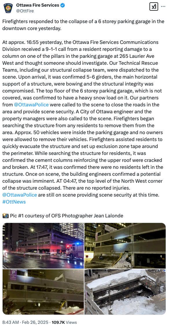 - *周二下午4:57,渥太华消防局接到报警,称停车场的一根支撑柱受损。