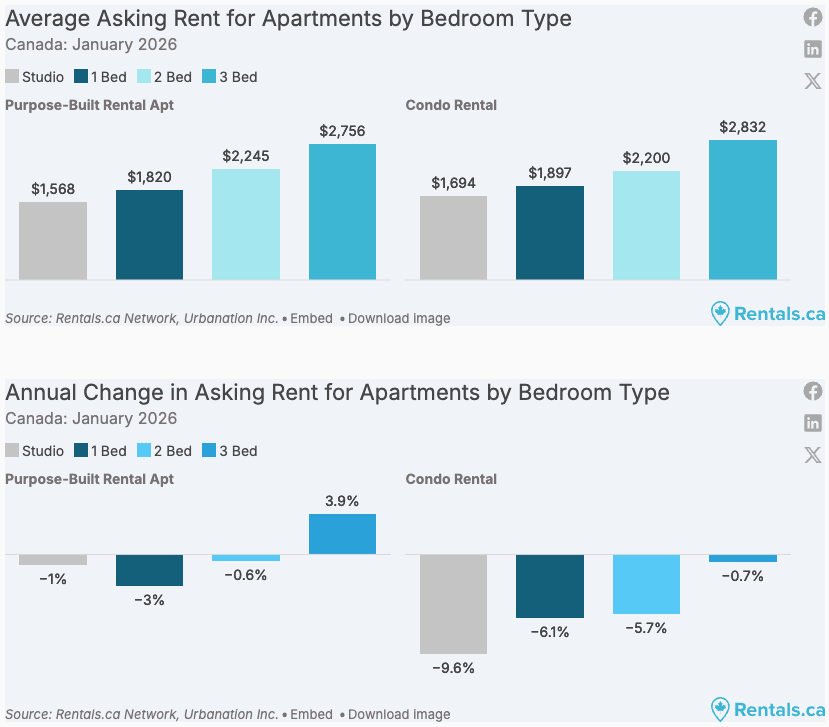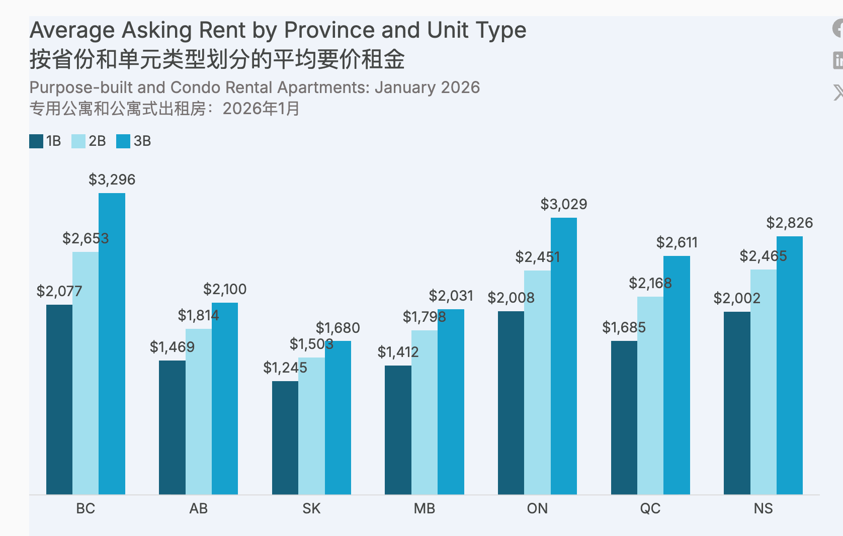 在专用出租公寓中,三居室租金同比上涨 3.9%,平均达到 2,756 加元。