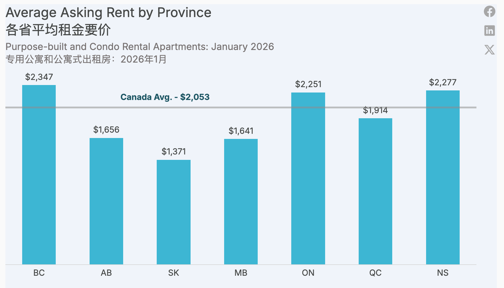 **专门建造的出租公寓(purpose-built rental)**租金同比下降 1%,平均为 2,049 加元。
