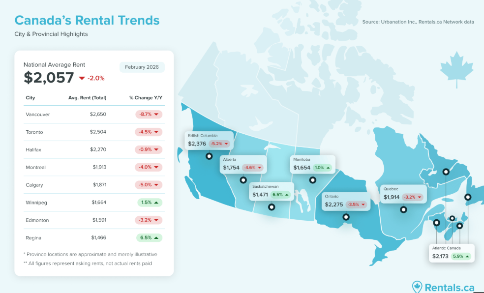 加拿大1 月份的挂牌租金同比下降 2%,平均租金为 2,057 加元,这是连续第 16 个月出现年度租金下降。