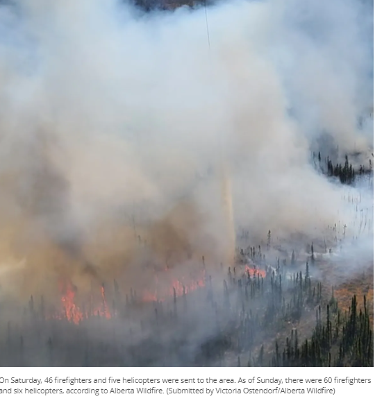 艾伯塔省野火在最新消息中说,截至周日上午 11 点 30 分,野火已扩大到 3,000 公顷,现在有 60 名消防员和六架直升机试图扑灭大火。