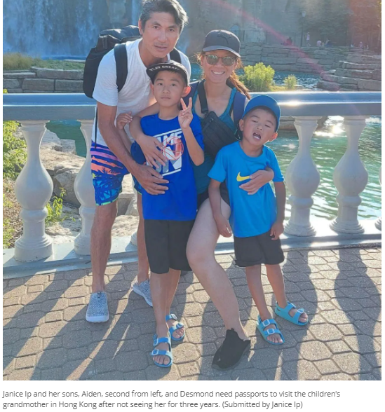 7 岁的 Aiden Ho 和 5 岁的弟弟 Desmond本可以前往香港看望他们的祖母,只要他们的母亲叶珍妮丝(Janice Ip)能办理好他们的护照。