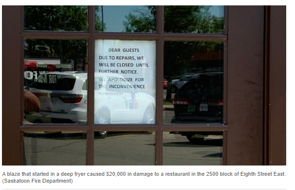 萨斯卡通消防局 (SFD) 表示,一场由炸锅引起的大火给位于第八街东2500号街区的一家餐厅造成了2万加元的损失。