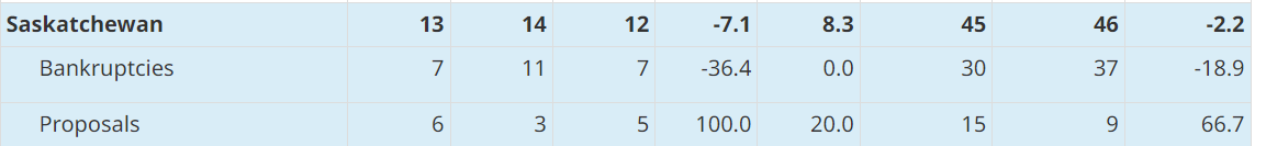 到 2022 年 6 月 30 日,已有 30 家企业宣布破产,而 2021 年有 37 家。然而,在截至 2022 年 6 月的 12 个月里,萨斯喀彻温省的企业提出了 15 份提案,而 2021 年的提案总数为 9 份。