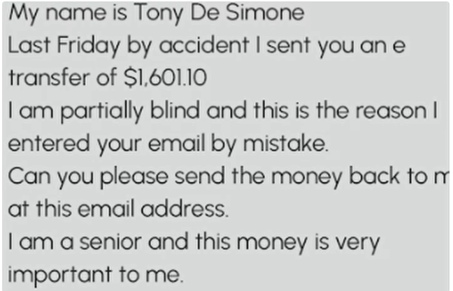 多伦多一名男子在圣诞节前后想通过 e-transfer 给姐姐转一笔钱,但他把姐姐的邮箱地址输错了,结果钱被转给了一个名字相似的人。几个月来,他一直想把这笔钱追回来。