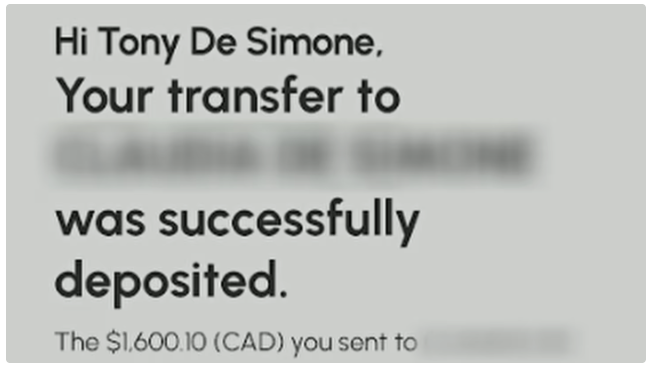 “我一直跟姐姐说我已经转了,因为正常情况下,她会收到一封 e-transfer 的收款通知邮件。”De Simone 回忆道。