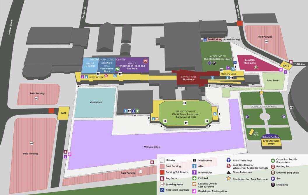 停车场和大门 Lewvan Drive Gate 步入式车道和免下车入口。停车费为10美元加上入场费。以先到先得的方式提供无障碍停车位。请确保您的无障碍停车许可证清晰地显示在车辆中。 埃尔芬斯通街和第十大道门 步入式和落客入口。不提供停车位。 公主街门 步入式和落客入口。酒店以先到先得的方式提供贵宾停车场和无障碍停车场。请确保您的无障碍停车许可证清晰地显示在车辆中。 Sportplex(Fieldhouse / Lawson水上运动中心)和历史悠久的Mosaic体育场提供额外收费停车场,价格为10美元。 婴儿车和轮椅租赁 ITC Lots Kids Center儿童中心提供婴儿推车和轮椅出租服务。 婴儿车租金为每小时5美元,押金25美元。 轮椅租赁服务每小时5美元,信用卡授权。 每日租金必须在晚上11点之前退回 联系信息 一般信息 Evraz Place主配电板 - 306-781-9200 Daytripper信息 Brandt中心票房 - 306-781-9300 皇后城前展览经理 切尔西加洛韦, cgalloway @ evrazplace.com 特许权咨询 Degan Middleton-Machdanz,食品和饮料业务 经理dmiddleton-machdanz@evrazplace.com或306-781-9298 参展商咨询 Cindy Heibein,展品协调员 cheibein@evrazplace.com 或306-781-9345 就业咨询 联系北美中途娱乐公司 https://www.namidway.com/come-work-for-us/或765-433-3038 赞助和广告咨询 有关更多信息,请联系赞助/广告 Sponsorship@evrazplace.com 媒体咨询 Shalyn Kivela,数字媒体和企业传播经理 s kivela@evrazplace.com 或306-541-4134