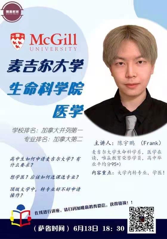 🌟LQ唯赢教育公益讲座名校巡礼-麦吉尔大学医学生命科学院 【讲座时间】 ⏰2021年6月13日-18:30(萨省时间) 【讲座内容】 📖华人高中生如何申请麦吉尔大学?申请要求是什么? 🏥中国学生想学医?应该如何选专业课? 🏫顶级大学之间是否可以转专业?如何申请? 【特邀讲师】 👨🏫陈宇鹏-Frank 🙋♂️麦吉尔大学生命科学系,医学在读,唯赢教育荣誉学员,高中毕业平均分95+。 【麦吉尔大学简介】 🏫麦吉尔大学(McGill University)始建于1821年,坐落于加拿大第二大都市蒙特利尔,是加拿大顶尖公立研究型大学。 💯麦吉尔作为加拿大对学术成绩要求最高的大学,其申请资格线,录取平均分和课程难度为全加拿大高校之首。 🎓该校拥有加拿大最高的博士生比例,培育了加拿大最多的诺贝尔奖得主,其罗德学者人数更远超加拿大其他高校,位居世界第4。 【报名方式】 请扫码加唯赢教育微信获取Zoom线上讲座链接和最新资讯哦!