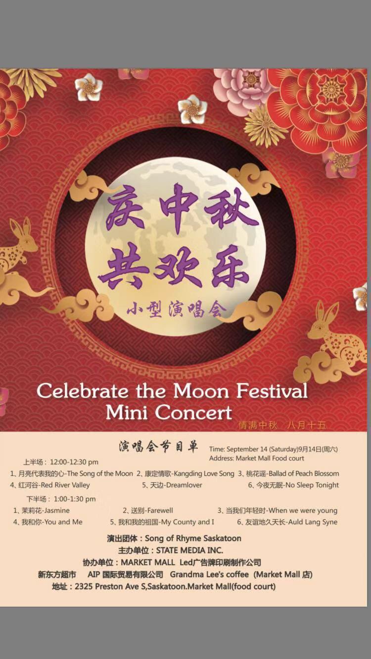 时间:2019年9月14日 12pm—1:30pm 地点:Market Mall (food court) 2325 Preston Ave S, Saskatoon