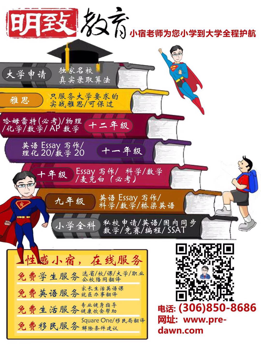 小宿老师讲私校申请 在上期“小宿开讲第四讲”中,不少在萨斯卡通上小学的家长们希望更多的了解加拿大私校小学高中申请,以及中加小学初中教育体系的差异。为此,小宿老师在本周日(9月22日)面向萨屯有志于离开萨省,并为孩子们谋划好出路的小学家长们宣讲卡尔加里与多伦多的私校概况,中加小学初中教育的区别以及私校申请规划。讲座内容有: 1. 何为私校?加拿大的私校有哪类?何时入学比较好? 2. 私校申请四要件是什么?如何提高学生的申请背景? 3. 热门目的地多伦多和卡尔加里有哪些好私校?她们各有怎样的特点? 4. 私校申请该如何规划? 讲座时间:本周日(9月22日)15:00-17:00 讲座地点:3337B 8st East (7-11便利店旁)